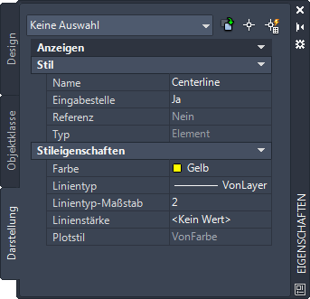 | Element | Gibt die Farbe, den Linientyp, den Linientypmaßstab, die Linienstärke und den Plotstil für Zeichnungsobjekte an, die diesen Stil verwenden. |