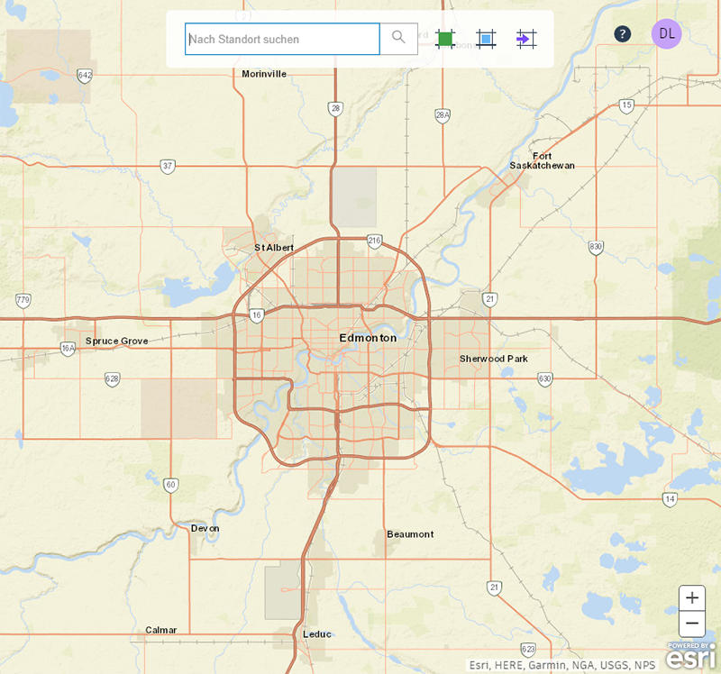 Geben Sie einen Ort, eine Adresse oder einen relevanten Punkt in die Suchleiste ein. Sie können auch Koordinaten für Längen- und Breitengrade eingeben oder eine SHP-Datei importieren, die Ihren relevanten Bereich definiert. Verwenden Sie die Maus, um die Ansicht zu schwenken und zu zoomen, oder nutzen Sie die Werkzeuge für Vergrößern/Verkleinern (Schaltflächen +/-), um Ihre Suche zu verfeinern. Verwenden Sie die Auswahlwerkzeuge, um den relevanten Bereich zu definieren.