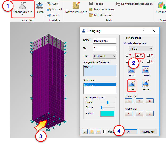 Als Nächstes fügen wir der Unterseite eine vertikale Abhängigkeit hinzu, um sicherzugehen, dass der Behälterboden auf dem Untergrund bleibt. Zusammen mit den beiden Symmetriebedingungen ermöglicht dies eine natürliche Ausdehnung des Behälters.