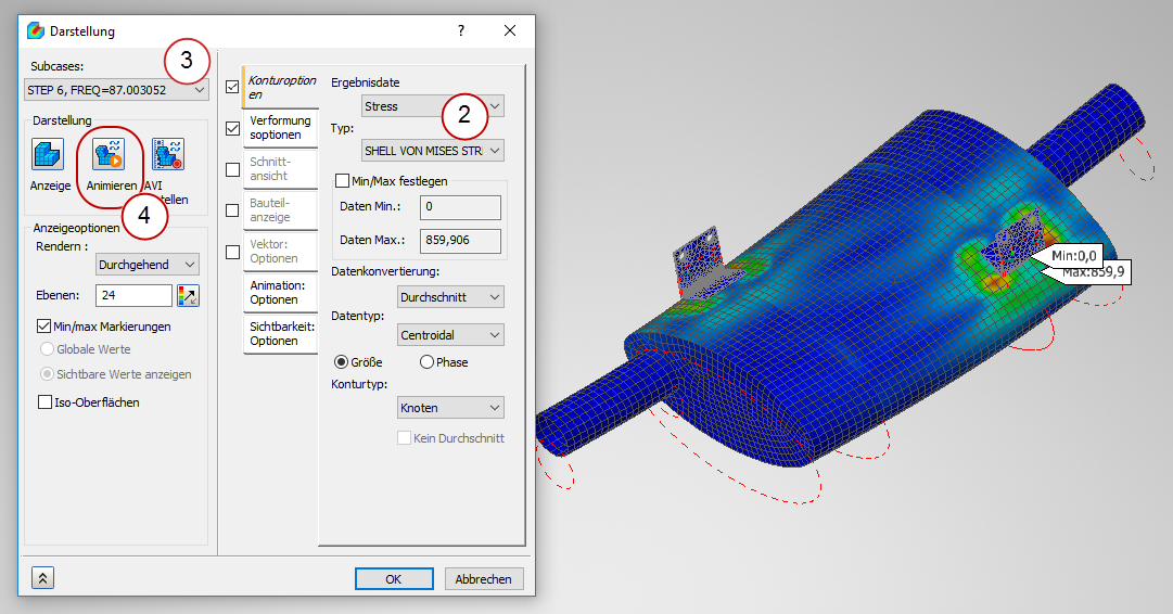 - Wählen Sie Spannung aus dem Menü Ergebnisdaten und SCHALE VON-MISES-SPANNUNG aus dem Typenmenü aus.