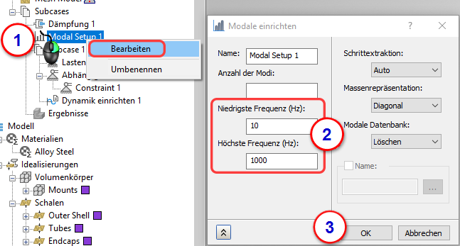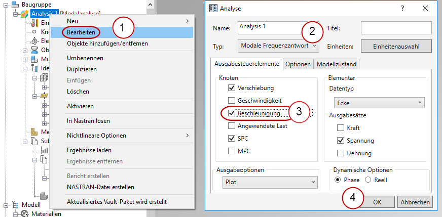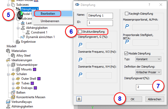 - Klicken Sie im Zweig Subcases mit der rechten Maustaste auf Damping1 und wählen Sie Bearbeiten.