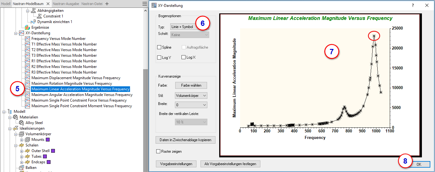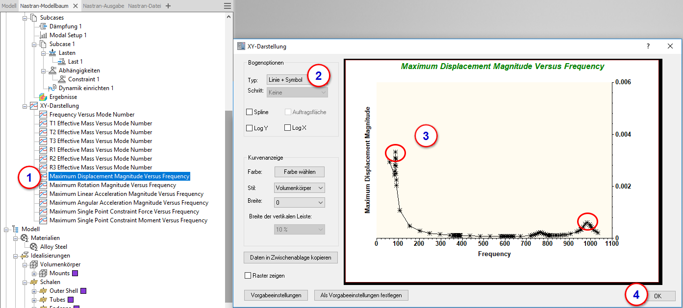 - Nach der Fertigstellung doppelklicken Sie auf die Darstellung der maximalen Verschiebung im Vergleich zur Frequenz aus der Analyse-Strukturansicht.