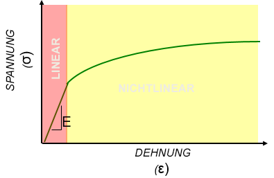 Ein nichtlineares Materialmodell kann als nichtlinear elastisch definiert werden, wenn das Formteil nach Entfernung der Last in den Nullzustand zurückgeht, oder als elastisch-plastisch, wenn sich nach Erreichen der Streckgrenze eine dauerhafte Dehnung aufzubauen beginnt.