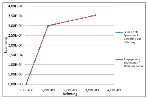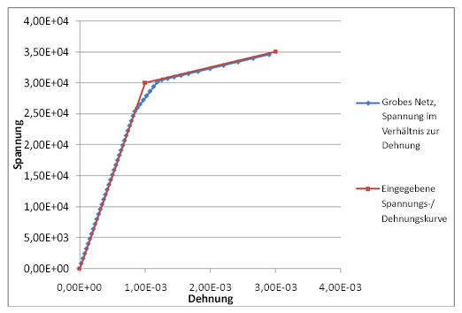 Die beiden folgenden Abbildungen unten zeigen die Spannungs-/Dehnungskurven für zwei unterschiedlichen Netzdichten. Wie Sie sehen, folgt ein feineres Netz genauer der eingegebenen Spannungs-/Dehnungskurve.