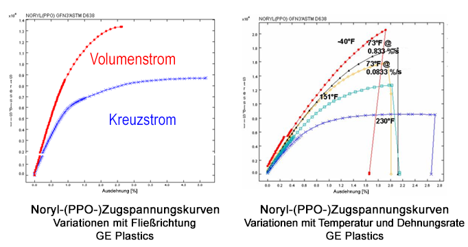 Die untenstehenden Kurven für Noryl, ein PPO von GE Plastics, wurden mit ASTM D638 gemessen, dem Standard-Zugtest für Kunststoffe. Die linke Kurve zeigt, wie sich die Spannungs-/Dehnungsbeziehung bei Kunststoffen mit der Spritzrichtung ändern kann. Die rechte Kurve zeigt, wie dasselbe Material bei unterschiedlichen Dehnungs- oder Belastungswerten und Temperaturen auch unterschiedliche Spannungs-/Dehnungsreaktionen aufweisen kann.