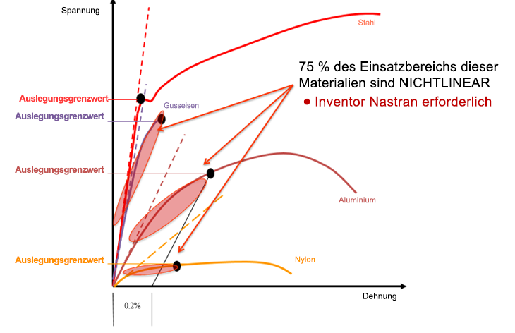 Wie in der folgenden Abbildung zu sehen, sind Nylon, Aluminium und Gusseisen Materialien, bei denen 75 % des Arbeitsbereichs nichtlineare sind. Hier benötigt man ein FEM-Programm wie Inventor Nastran, um die Strukturreaktion auf Betriebslasten zu berechnen.
