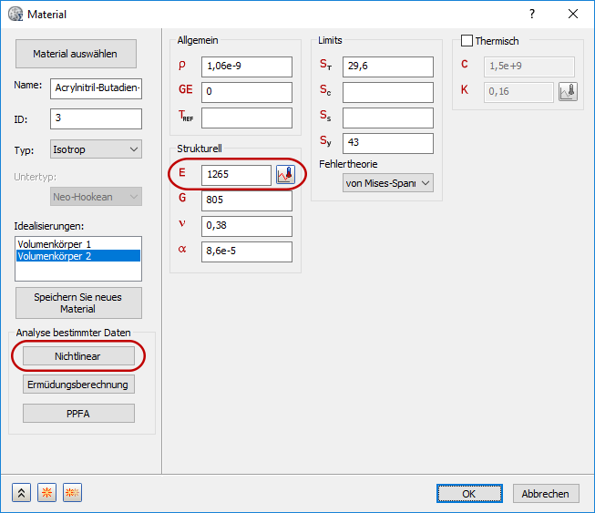 4. Geben Sie im Dialogfeld "Material" für E den Wert 1265 MPa ein.