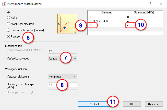 8. Setzen Sie die Ausgangsstreckgrenze auf 43 MPa.