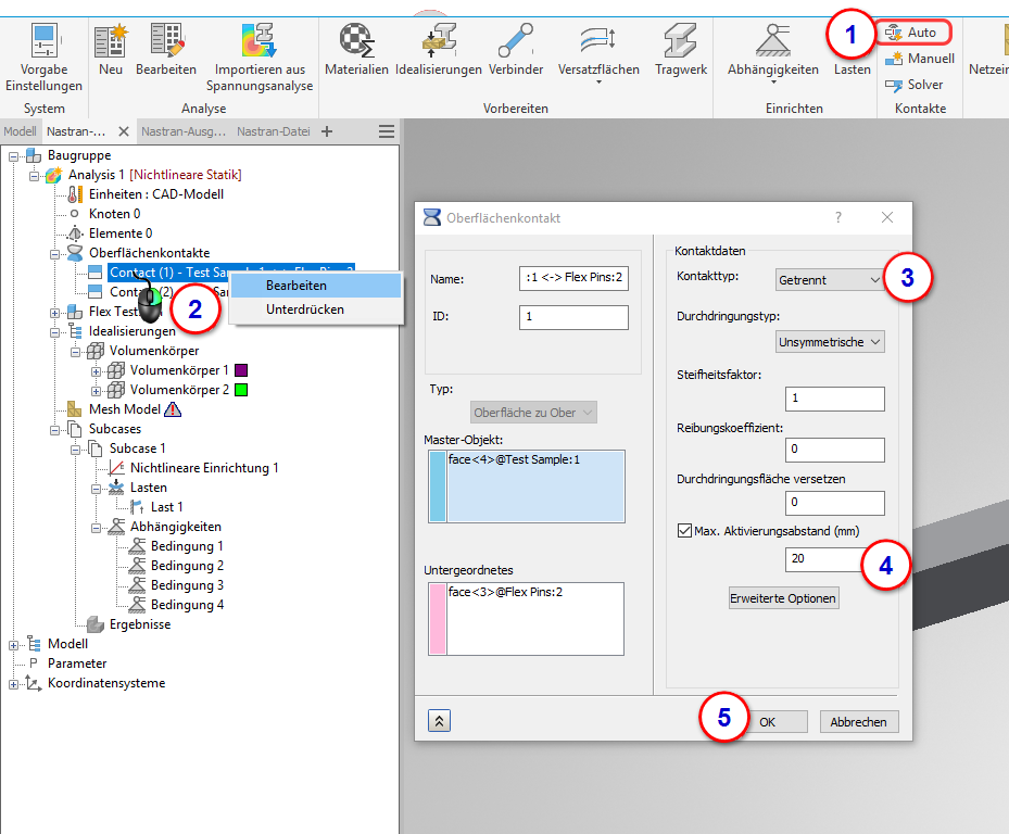 2. Erweitern Sie in der Analyse-Strukturansicht den Zweig "Flächenkontakte", klicken Sie mit der rechten Maustaste auf den ersten Kontakt und anschließend auf bearbeiten.