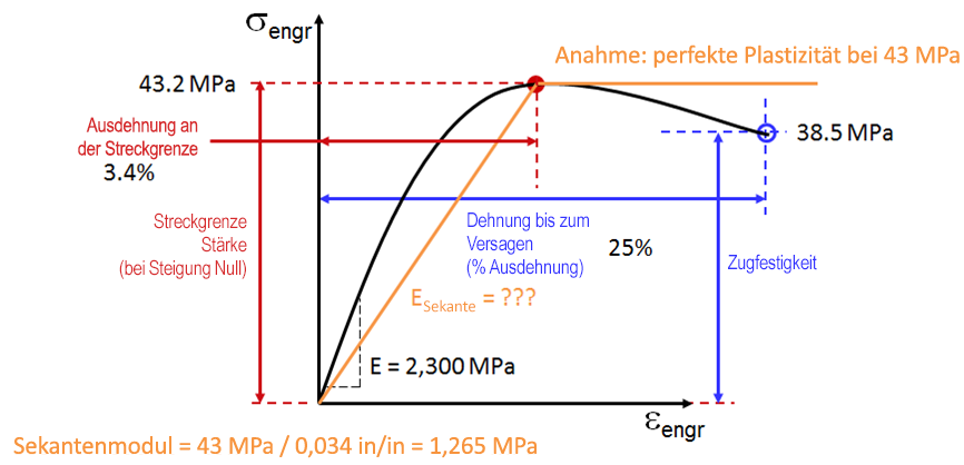 Die typische ABS-Spannungs-/Dehnungskurve (aus MatWeb-Mittelwerten) sieht wie folgt aus: