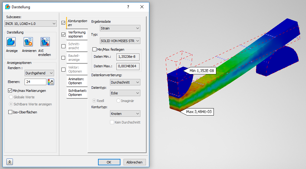 1. Klicken Sie auf die Registerkarte Konturoptionen, wählen Sie anschließend Dehnung aus dem Ergebnisdaten-Menü und setzen Sie den Typ auf FESTKÖRPER-VON-MISES-SPANNUNG. Falls die Ergebnisse nicht angezeigt werden, klicken Sie auf Anzeige.