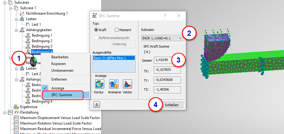 1. Klicken Sie mit der rechten Maustaste auf die Schiebeabhängigkeit von Subcase 1 und wählen Sie SPC-Summe aus. (Wenn Sie Ihren Abhängigkeiten keine Namen gegebenhaben, klicken Sie auf jede einzelne, is Sie diejenige finden, die der Oberseite des Stifts zugeordnet ist.)