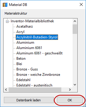 3. Klicken Sie im Dialogfeld "Material" auf Material auswählen. Erweitern Sie die Inventor Material Library und wählen Sie Acrylnitril-Butadien-Styrol. Klicken Sie auf OK.