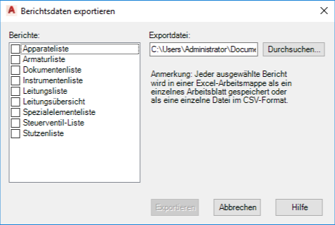 Exportiert die ausgewählten Berichte in Dateien mit angegebenem Namen im angegebenen Ordner. Jeder von Ihnen ausgewählte Berichtstyp wird auf einem getrennten Arbeitsblatt einer Excel-Arbeitsmappe angezeigt oder als eine individuelle CSV-Datei gespeichert.