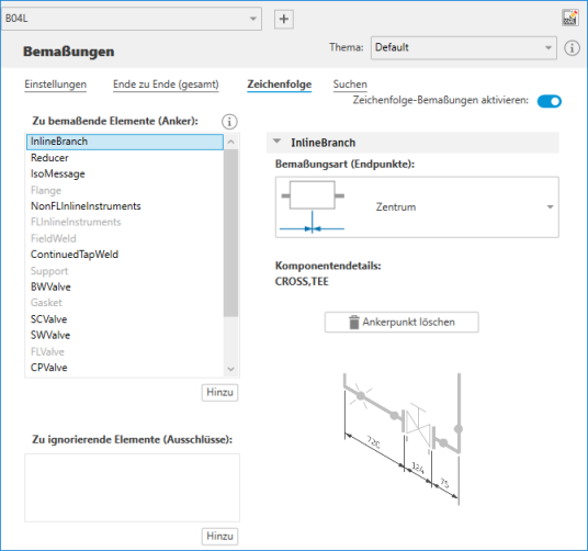 - Aktivieren oder deaktivieren Sie Letzte Zeichenfolgenbemaßung ausblenden. Durch die Auswahl dieser Option wird die letzte Zeichenfolgenbemaßung in einem linearen Rohrleitungssegment entfernt, wenn dieses zusammen mit Ende-zu-Ende-Bemaßungen verwendet wird, um zu verhindern, dass die Bemaßungen überbestimmt werden.