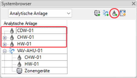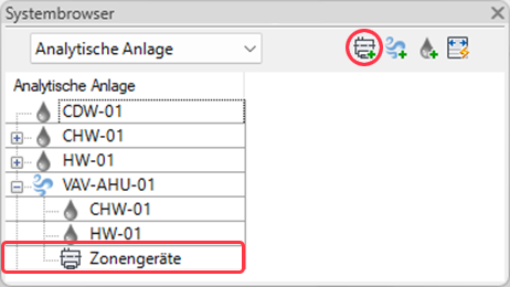 Im Systembrowser wird die Hierarchie der Systemzonen und der analytischen Anlagen (Wasserkreisläufe, Lüftungsanlagen und Zonengeräte) angezeigt.
