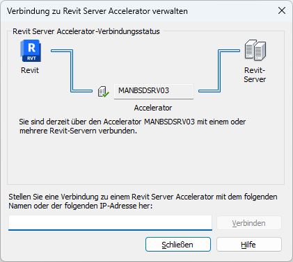 Gehen Sie wie folgt vor, um den Status der Verbindung mit dem für Ihren Standort zugewiesenen Accelerator (mithilfe der Umgebungsvariablen RSACCELERATOR2026 Release Ihres Systems) zu prüfen und bei Bedarf einen anderen Accelerator anzugeben. Wenn Ihre Netzwerkverbindung zum Revit Server Accelerator unterbrochen wird oder Sie entscheiden, ihn nicht zu verwenden, werden Sie direkt mit den Revit Servern verbunden.