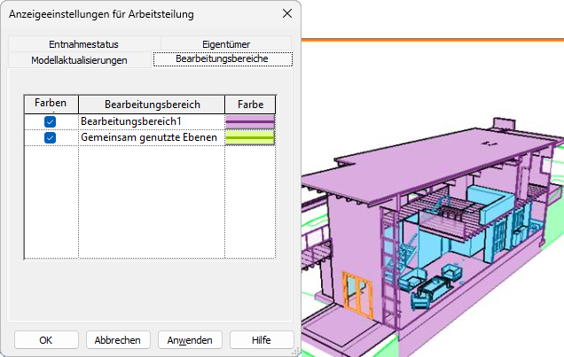Sie können Bearbeitungsbereiche in einem Projekt mit Arbeitsteilung visuell unterscheiden.