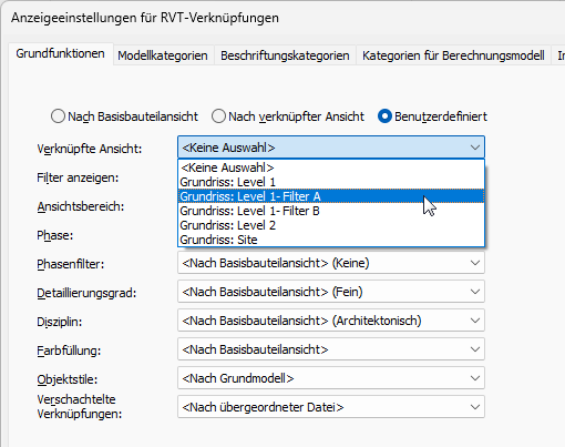 - Gehen Sie im Dialogfeld Anzeigeeinstellungen für RVT-Verknüpfungen auf der Registerkarte Grundfunktionen wie folgt vor: