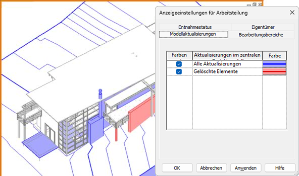 Sie können in der Anzeige sehen, welche Elemente in einem Modell mit Arbeitsteilung im zentralen Modell aktualisiert oder daraus gelöscht wurden.