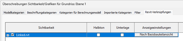 Wenn Nach Basisbauteilansicht nicht angezeigt wird, klicken Sie in die Spalte Anzeigeeinstellungen. Wählen Sie im Dialogfeld Anzeigeeinstellungen für RVT-Verknüpfungen auf der Registerkarte Grundfunktionen die Option Nach Basisbauteilansicht, und klicken Sie auf OK.