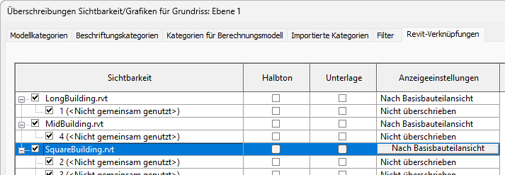 Die Registerkarte Revit-Verknüpfungen im Dialogfeld Sichtbarkeit/Grafiken enthält die folgenden Spalten: