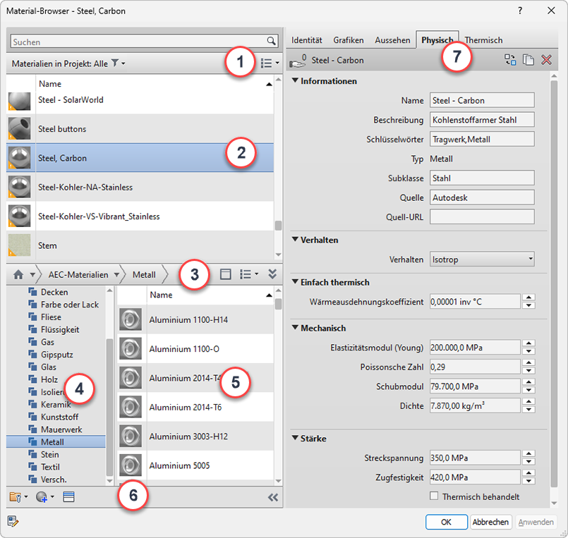 | 6 | Werkzeugkasten des Material-Browsers: Enthält Steuerelemente zum Verwalten von Bibliotheken, zum Erstellen neuer oder Duplizieren bestehender Materialien und zum Öffnen und Schließen des Objekt-Browsers. |