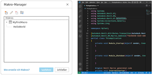 Zusätzlich zu diesen API-Erweiterungen können Sie mithilfe der API auch Makros definieren, die in Revit ausgeführt werden. Die Unterschiede bezüglich der API werden weiter unten in diesem Thema erläutert. Für erfahrene Entwickler geben wir hier den Hinweis, dass es nicht erforderlich ist, die Makros in Revit.ini zu registrieren oder RevitAPI.dll als Referenz hinzuzufügen.