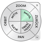 Sie können die Geschwindigkeit der Bewegung steuern, wenn Sie durch das Modell laufen oder "fliegen". Die Bewegungsgeschwindigkeit wird durch den Abstand, in dem der Mauszeiger vom Symbol Mittelkreis bewegt wird, und durch die aktuelle Einstellung für die Bewegungsgeschwindigkeit gesteuert. Sie können die Einstellung für die Bewegungsgeschwindigkeit dauerhaft und vorübergehend anpassen, während Sie das 2D-Navigationswerkzeug verwenden. Um die Bewegungsgeschwindigkeit dauerhaft anzupassen, verwenden Sie das Dialogfeld Optionen des SteeringWheel oder die Tasten < und >, wenn das 2D-Navigationswerkzeug aktiviert ist. Sie können auch mit der rechten Maustaste auf das Rad klicken, um das Menü Rad auszuwählen, und dann Navigationsgeschwindigkeit erhöhen oder Navigationsgeschwindigkeit senken auswählen. Um die Bewegungsgeschwindigkeit vorübergehend zu erhöhen, drücken Sie die Plus-Taste (+) während Sie das 2D-Navigationswerkzeug verwenden