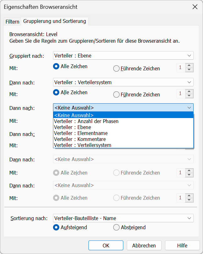 Sie können nach Verteiler-Bauteilliste – Name, Verteilersystem, Kommentaren, Ebene, Anzahl der Phasen sortieren, Projektparameter und gemeinsam genutzte Parameter für Verteiler-Bauteillisten sowie Kommentare für Verteiler zum Gruppieren und Filtern verwenden sowie die Verteiler-Bauteillisten nach Anzahl der Phasen filtern.