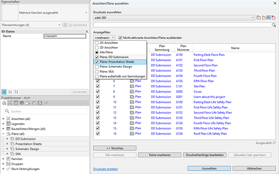 - Das Dialogfeld zum Exportieren und Drucken enthält alle Plansammlungen als dedizierte Anzeigefilter-Schalter, um die präzise Auswahl von Plänen in einer oder mehreren Sammlungen zu unterstützen.