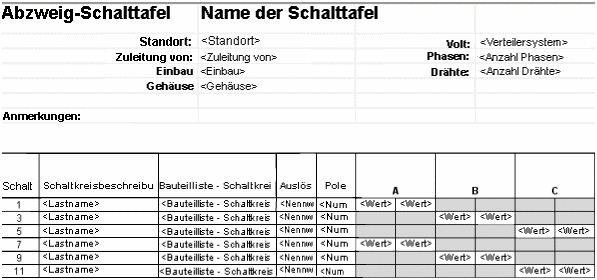 5. In der nachstehend abgebildeten Vorlage wurden die Parameter für die Kopfzeile und die Stromkreisnotizen hinzugefügt. Beachten Sie, dass die Bauteillisten-Stromkreis-Notizen als Spalte hinzugefügt werden.