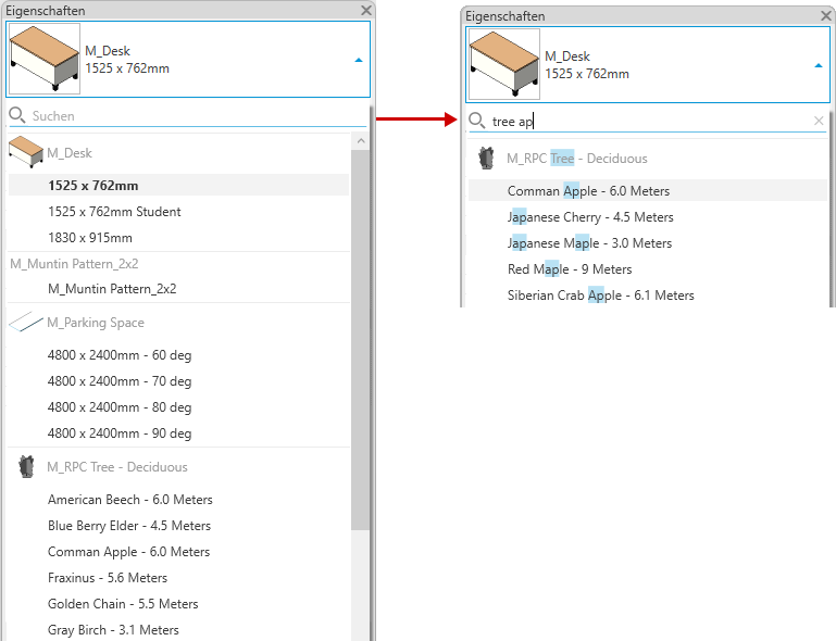 Revit steht eine Suchfunktion zur Verfügung, die die Auswahl in langen Listen von Optionen erleichtert. Sie können in den folgenden Funktionsbereichen suchen: