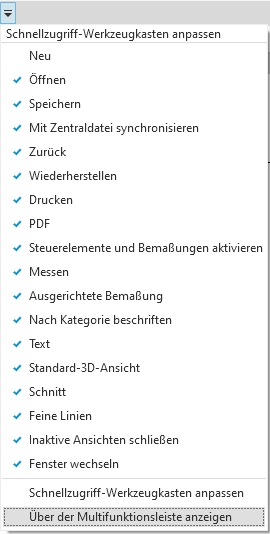 Wenn Sie vorgegebene Werkzeuge aus dem Schnellzugriff-Werkzeugkasten entfernt haben, können Sie sie erneut hinzufügen, indem Sie in der Dropdown-Liste Schnellzugriff-Werkzeugkasten anpassen das Werkzeug wählen, das Sie hinzufügen möchten.