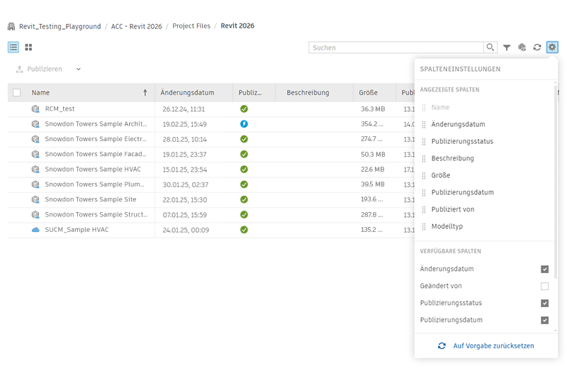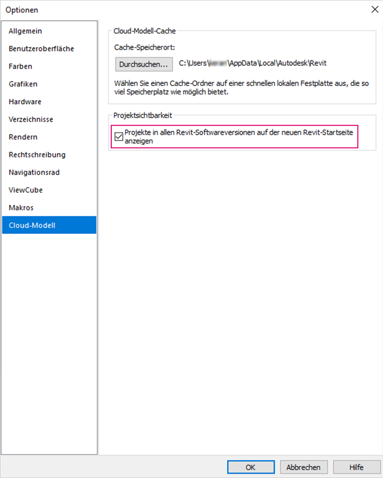 Sie verfügen über eine Sichtbarkeitsfunktion, mit der Projekte aus allen Revit-Versionen angezeigt werden. Projekte in anderen Revit-Versionen als der aktuell ausgeführten werden im deaktivierten Status angezeigt. Sie können diese Funktion aktivieren und deaktivieren. Aktivieren Sie unter Dialogfeld Optionen