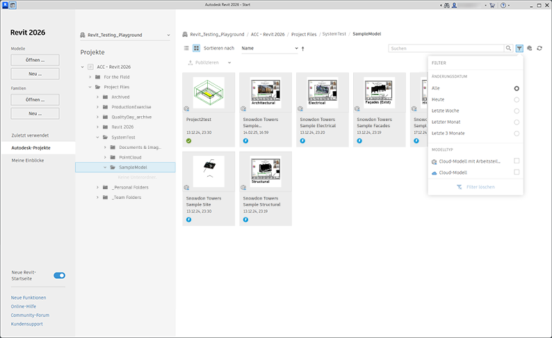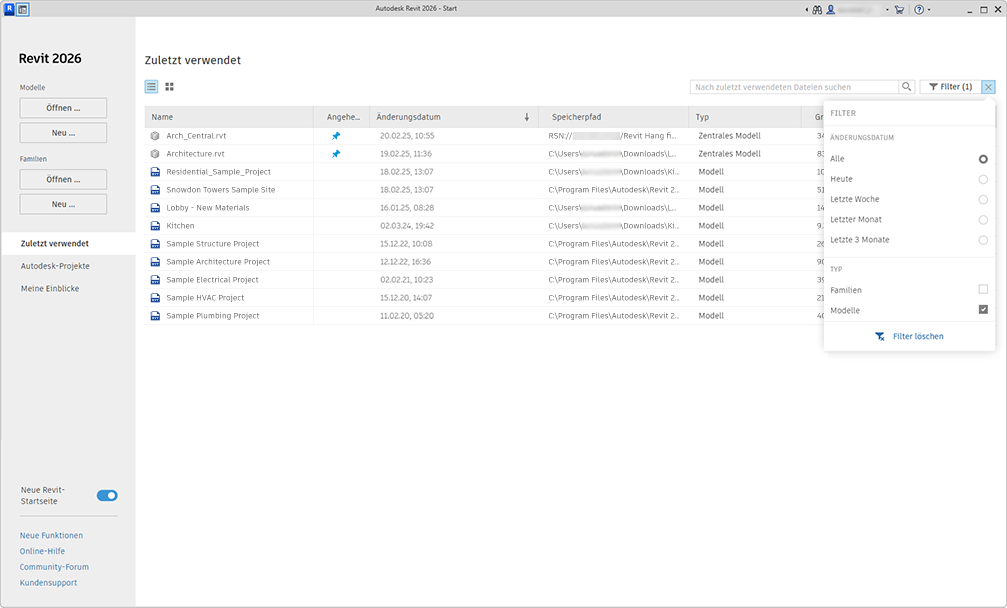 Die neue Revit-Startseite bietet weitere Möglichkeiten zum Anzeigen, Sortieren und Suchen von Modellen und Versionen.