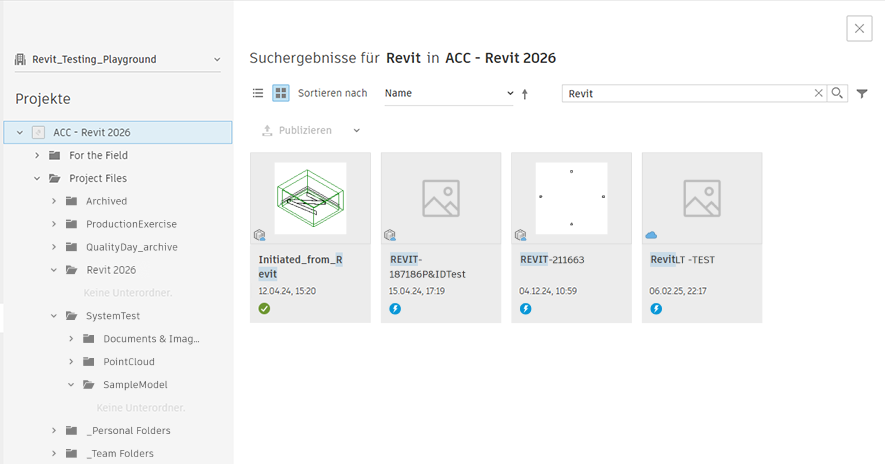 - Raster- und Listenansichten verfügbar. In der Rasteransicht Projekte werden Miniaturansichten der Cloud-Modelle, Symbole für die einzelnen Modelltypen (mit oder ohne Arbeitsteilung) und der Publizierungsstatus mit Symbolen angezeigt.