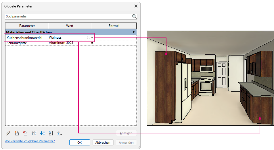 Wenn Sie den Wert eines neu erstellten globalen Materialparameters ändern möchten, klicken Sie auf Registerkarte Verwalten Gruppe Einstellungen (Globale Parameter). Wählen Sie ein anderes Material. Dieses wird auf die Schreinerarbeiten in der Küche angewendet. Sie müssen die Typenparameter nicht mehr für jede Familie einzeln ändern.