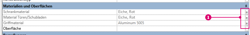 Nachdem der globale Parameter für das Material erstellt wurde, weisen Sie ihn dem Materialparameterwert in den Schrankfamilien zu, die im Küchenlayout verwendet werden.