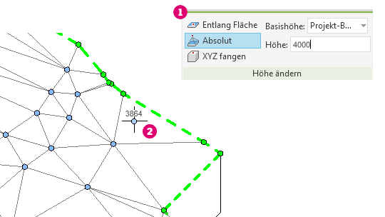 Wenn Sie während der Formbearbeitung Punkte hinzufügen, können Sie die Einstellung Basishöhe verwenden, um die relative Höhe des Punkts zu definieren. Sie können die Höhen von der aktuellen Ebene, vom Projekt-Basispunkt, vom Vermessungspunkt und vom internen Ursprung aus messen. Sie können festlegen, ob die Punkte in einer absoluten Höhe von der ausgewählten Bezugsebene hinzugefügt werden oder in einem bestimmten Abstand von der bestehenden Oberfläche.