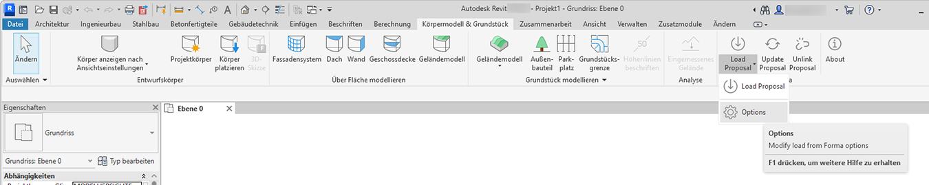 Öffnen Sie Revit, und erstellen Sie ein neues Projekt. Suchen Sie auf der Registerkarte Körpermodell & Grundstück nach der Schaltfläche Vorschlag laden.