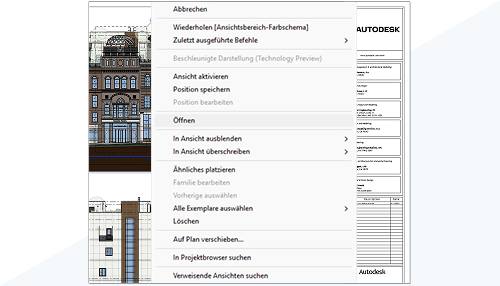 Sie können jetzt eine oder mehrere platzierte Ansichten direkt aus einem Plan öffnen. Wählen Sie die gewünschten Ansichten aus, klicken Sie mit der rechten Maustaste, und wählen Sie dann Öffnen aus der kontextabhängigen Liste aus.
