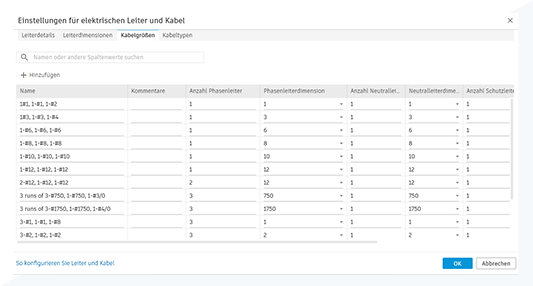 Elektrische Leiter und Kabel können angepasst werden. Mit den neuen Einstellungen für elektrischen Leiter und Kabel können Sie Leiter definieren und diese Leiterdefinitionen dann in Kabelgrößen und Kabeltypen verwenden. Diese Kabeltypen werden dann Stromkreisen in Ihren Modellen zugewiesen.