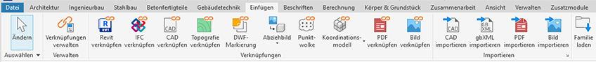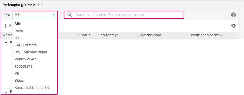Im Dialogfeld Verknüpfungen verwalten werden alle CAD-Formate für verknüpfte Dateien und nur die importierten DWG-, DXF-, DGN-, SKP- und AXM-CAD-Formate für Projekte und Familien angezeigt.