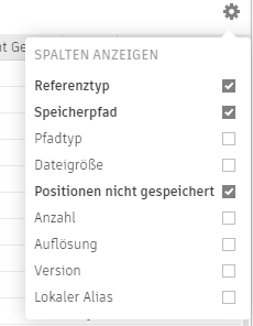 Um die Sichtbarkeit der einzelnen Spalten festzulegen, verwenden Sie die Liste Spalten anzeigen über das Zahnradsymbol oben rechts in der Tabelle.