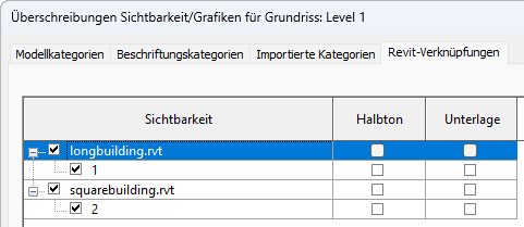 Für die Sichtbarkeit und Grafiken verknüpfter Revit-Modelle steht im Dialogfeld Sichtbarkeit/Grafiken eine eigene Registerkarte (Revit-Verknüpfungen) mit entsprechenden Parametern zur Verfügung.