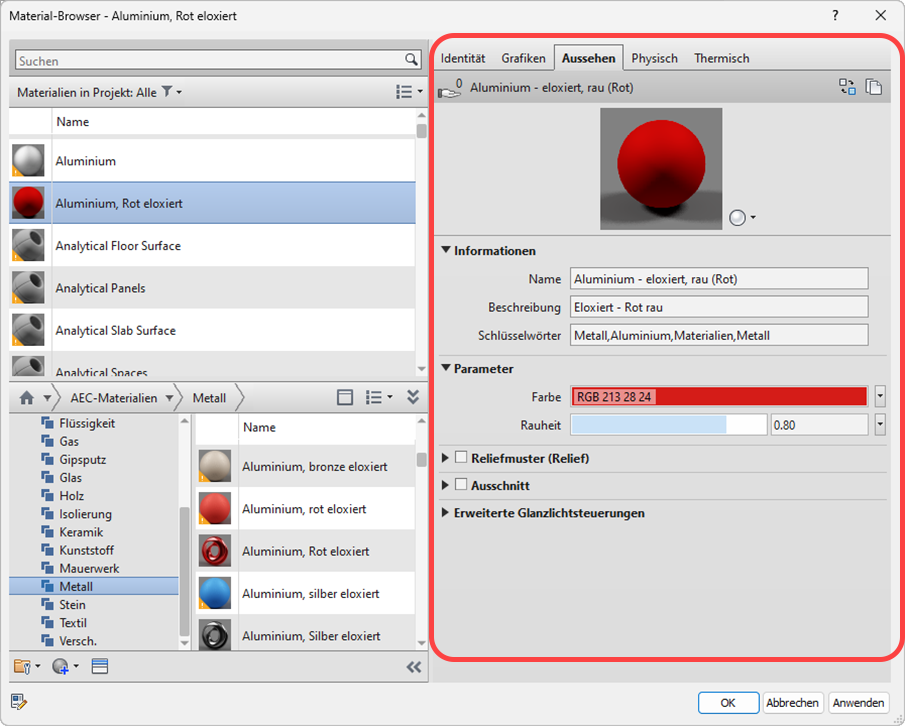 Diese Informationen werden im Material-Browser im Bereich Material-Editor auf den Registerkarten ID, Grafiken und Darstellung angezeigt.
