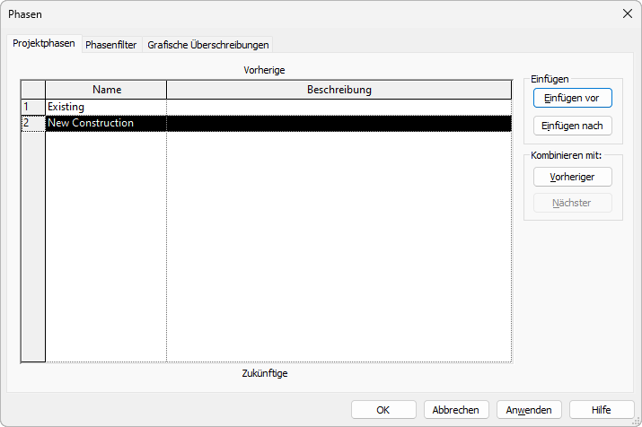 Das Dialogfeld Phasen wird geöffnet und die Registerkarte Projektphasen angezeigt. Standardmäßig verfügt jedes Projekt über die Phasen Vorhanden und Neue Konstruktion.