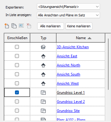 Verwenden Sie beim Exportieren eines Modells in verschiedene Formate die Werkzeuge im Dialogfeld Exportieren, um die einzubeziehenden Ansichten und Pläne auszuwählen. Speichern Sie den ausgewählten Satz zur späteren Wiederverwendung.