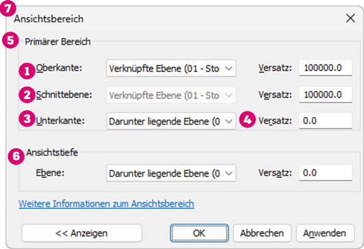 Bei Draufsichten steht die Eigenschaft Ansichtsbereich (auch: sichtbarer Bereich) zur Verfügung. Die horizontalen Ebenen, die den Ansichtsbereich definieren, sind Oben, Schnittebene und Unten. Die obere und die untere Schnittebene stellen den obersten und untersten Teil des Ansichtsbereichs dar. Die Schnittebene legt fest, auf welcher Höhe bestimmte Elemente als Schnitte angezeigt werden sollen. Diese drei Ebenen bilden den primären Bereich des Ansichtsbereichs.